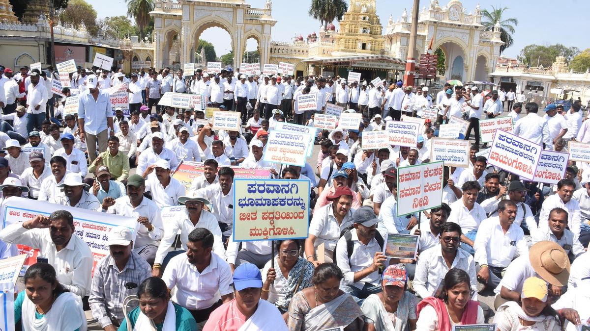 Licensed surveyors stage demonstration in Mysuru -- A large number of licensed surveyors of the Department of Land Survey struck work and staged a demonstration in Mysuru on Thursday to press for their long-pending demands including regularization of their services as Government Land Surveyors. Hindu at Thursday, April 9, 2026, 11:07:53 PM |